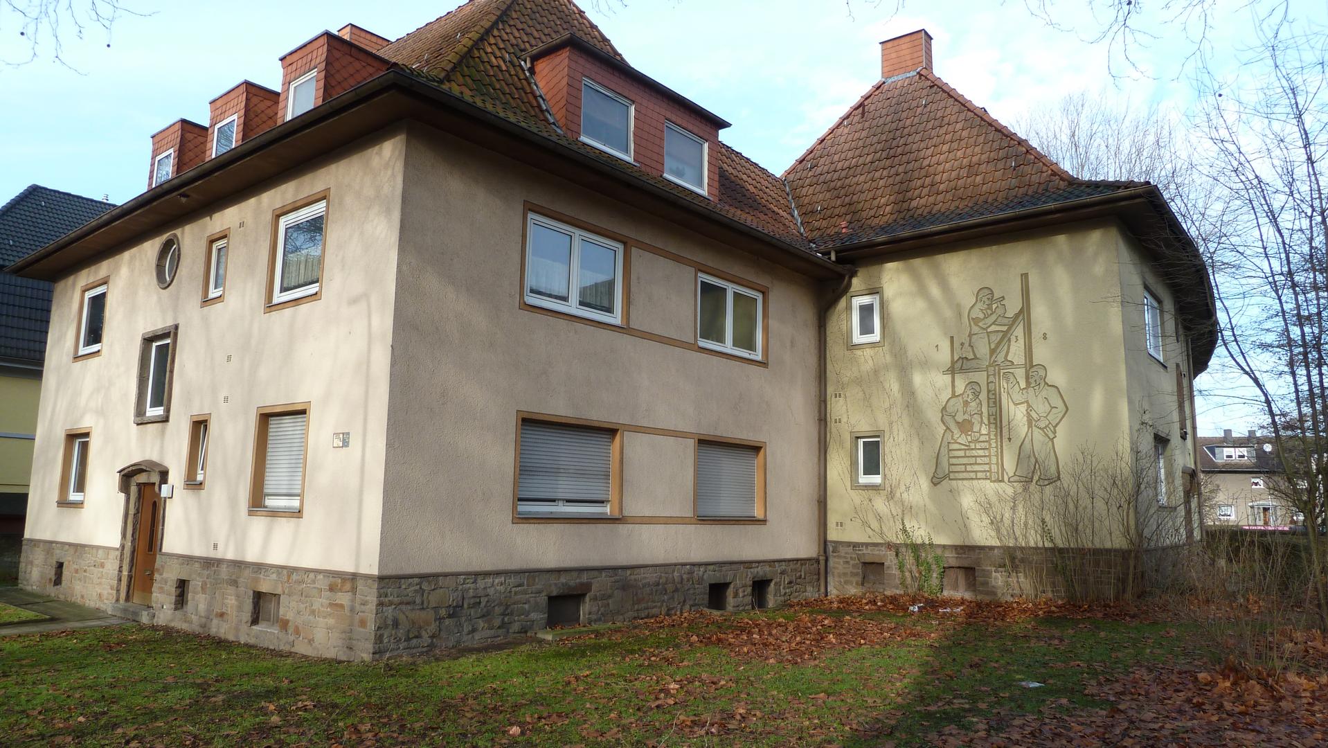 Das Sgraffito an dem Gebäude der Heim- und Wohngenossenschaft ist das älteste bekannte in Bochum. Ein weiteres, nicht erhaltenes befand sich an der anderen Kopfwand der Siedlung.